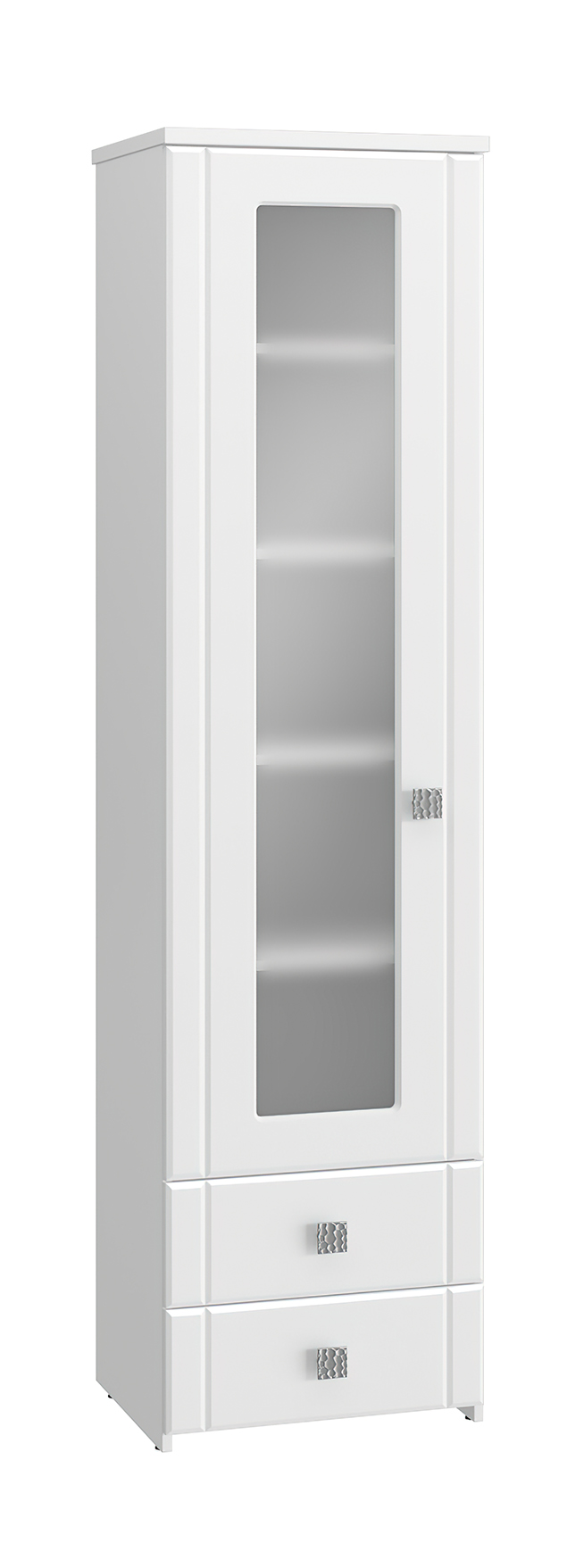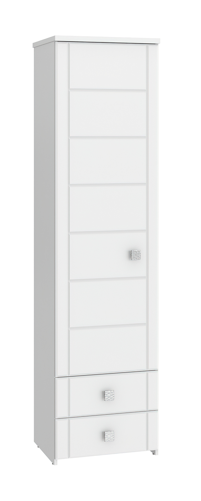 Размеры модуля (ш/в/г) в мм: 550х2106х450 Цвет корпуса/фасада: белый структурный/белое дерево Материал корпуса/фасада: ЛДСП, МДФ  Шкаф-пенал с зеркалом Изабель ИЗ-63К предназначен для белья или книг, оснащен для вашего удобства четырьмя полками и двумя выдвижными ящиками. Модуль может быть собран "левым" или "правым". Крышка выполнена из ЛДСП 25 мм, дно ящиков двп 3 мм. Фурнитура: металлизированные квадратные ручки, петли с доводчиками, телескопические направляющие полного выдвижения без доводчиков.  Важная информация. Мебель доставляется